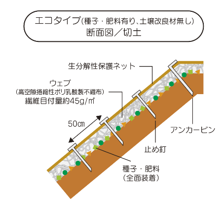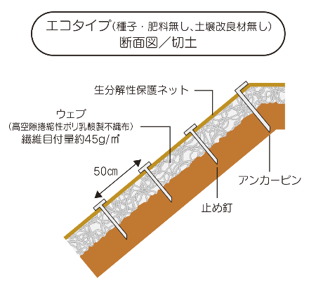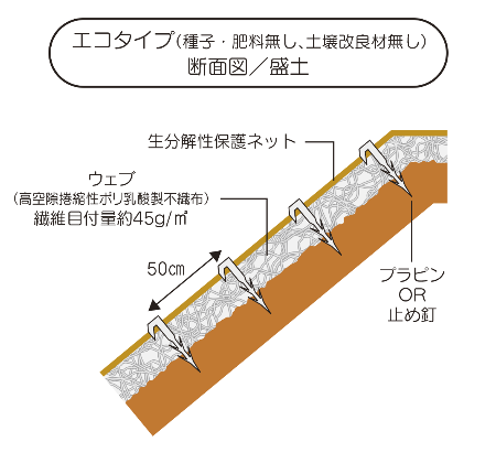 多機能フィルター・エコタイプは、SPタイプとMFタイプの使用材質(保護ネット、ウェブ)を生分解性材質へ変更した製品です。多機能フィルターの効果(土壌侵食防止、濁水抑制、植生導入等)に加え、自然環境に配慮した製品です。