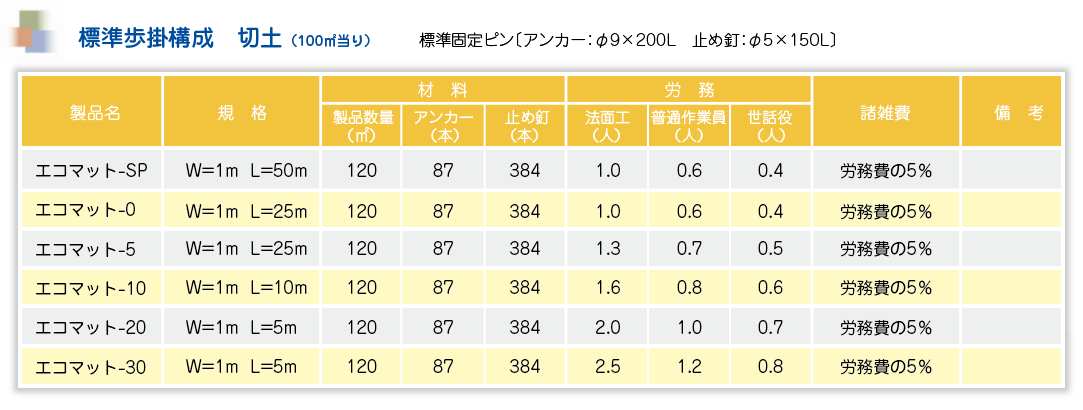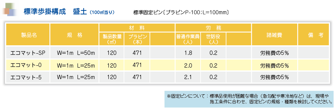 | 製品名 | 設計価格〔円/㎡〕 | 種子 | 肥料 | 土壌改良材 | |