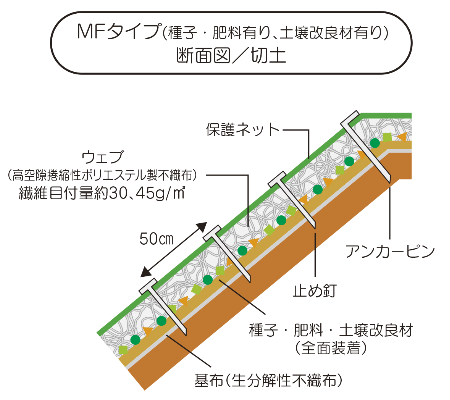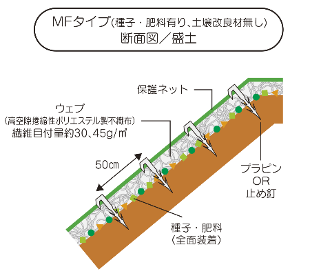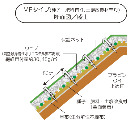 多機能フィルター・MFタイプは、保護ネット、ウェブ(不織布)、種子、肥料、土壌改良材が一体化した製品です。