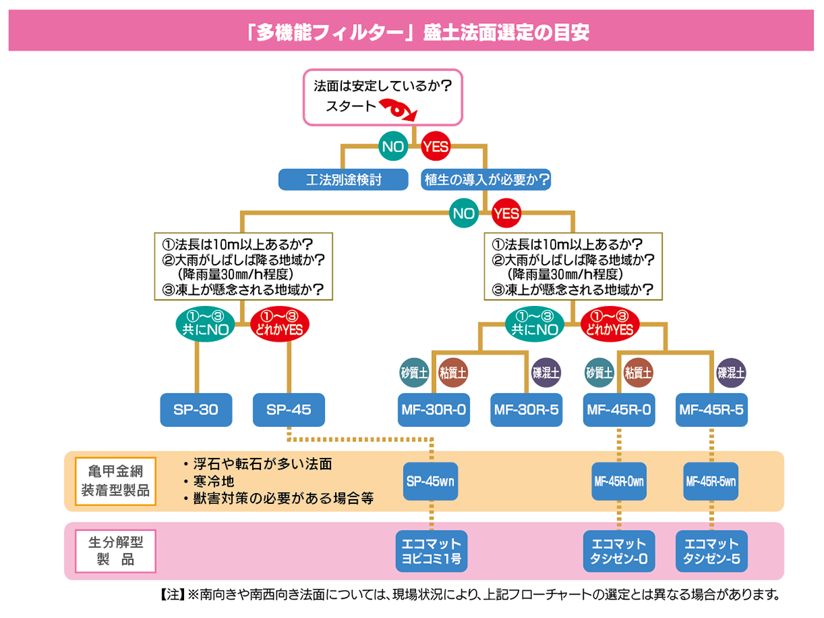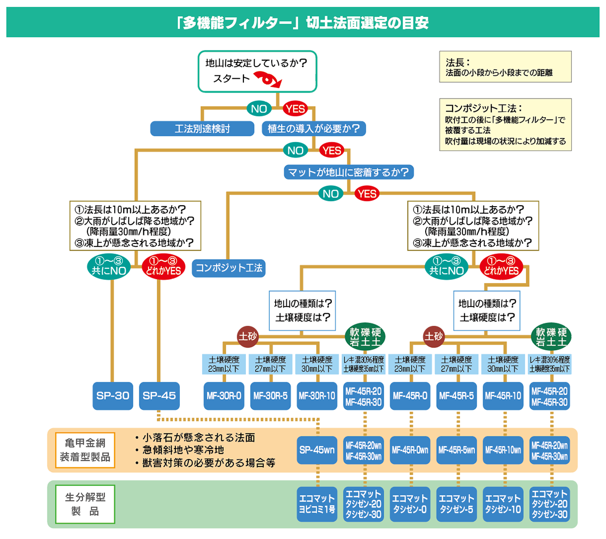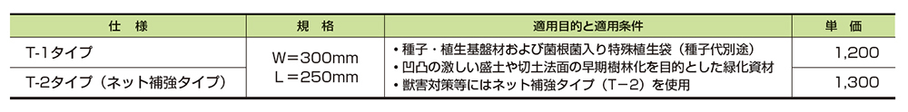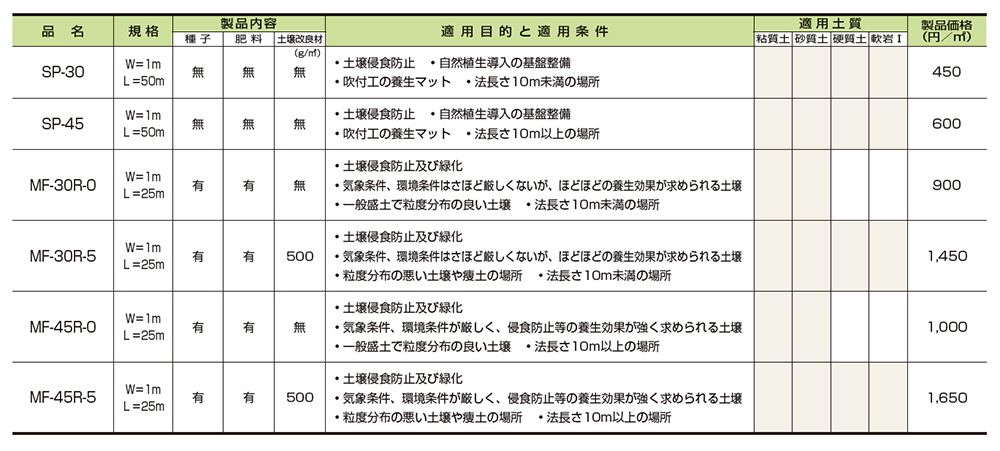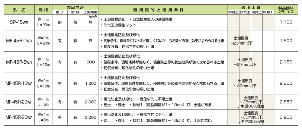 ※45タイプは特に侵食を受け易い土質(シラス、マサなど)および気象条件の厳しい現場で顕著な侵食防止、気象緩和のマルチング効果を発揮します。高盛土など降雨面積が大きく流下水の多い法面では非常に有効です。