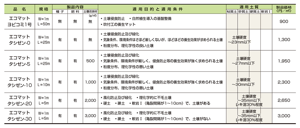 ◉末尾の30・20・10・5・0の数字は、各々土壌改良材の含有重量を示し、植生の難易度に応じて使い分けます。