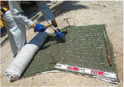 ■マットと地山が密着するように、凹部や岩部、転石箇所については固定ピンを割り増し、浮き上がりを出来る限り抑え込んでください。