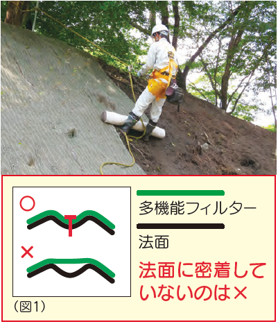 ■マットは法面の凸凹に這わせるようにユッタリと延展し、決して引っ張らないでください。(図1)