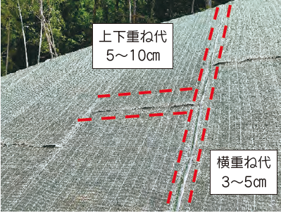 ■隣との重ね部分は深く被せず、縁の保護ネット同士を重ねて固定ピンで巻き込んでから打ち付けます。