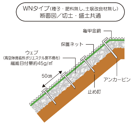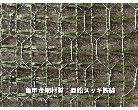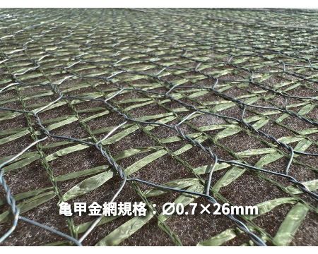 多機能フィルター・WNタイプは、SPタイプとMFタイプの最表面に亀甲金網を総着した製品となります。通常の多機能フィルターの効果(土壌侵食防止、濁水抑制、植生導入等)と亀甲金網の補強効果で、起伏の多い法面、小落石が懸念される法面、急傾斜地や寒冷地、獣害対策の必要がある場合等の法面保護として使用します。